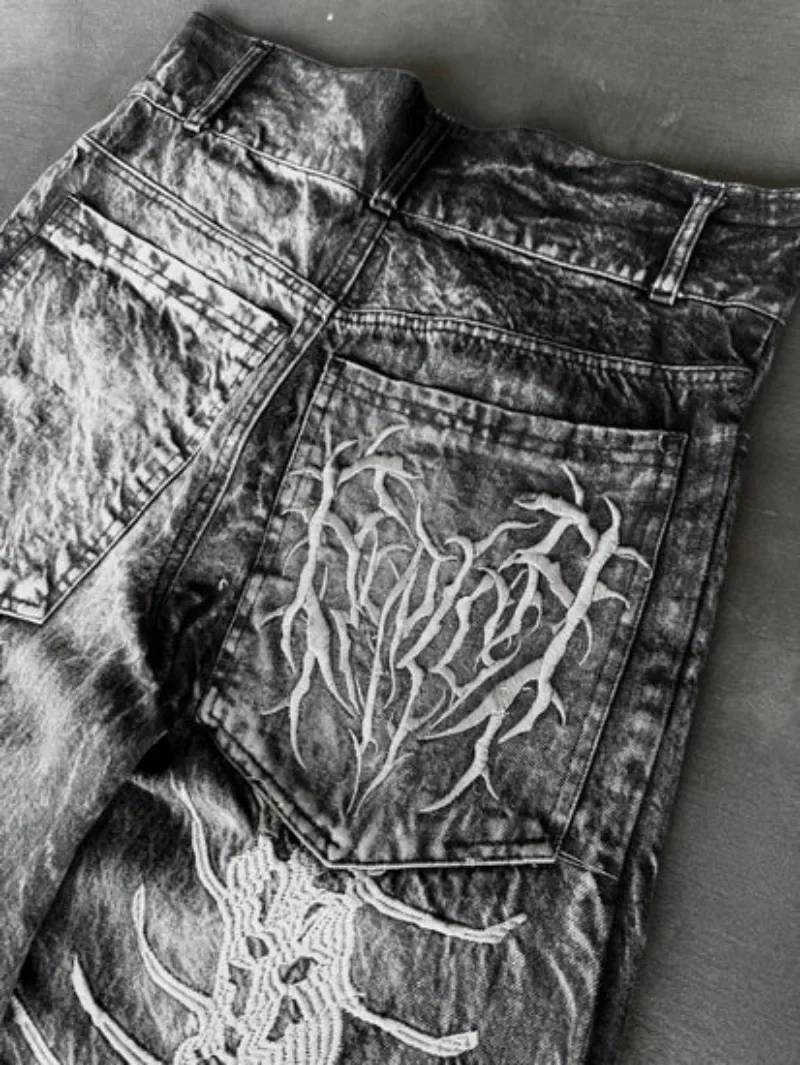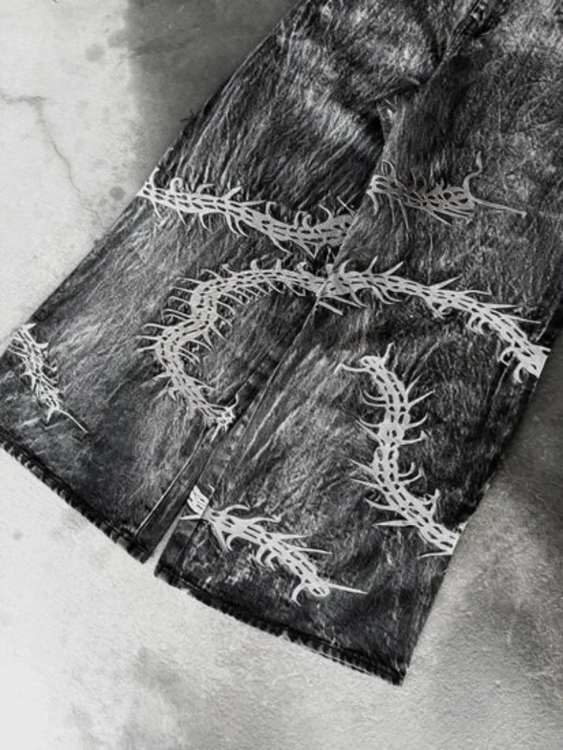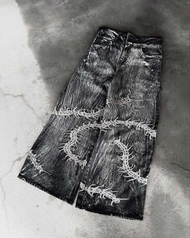 Retro Centipede Embroidery Pattern Oversized Wide-Leg Pants